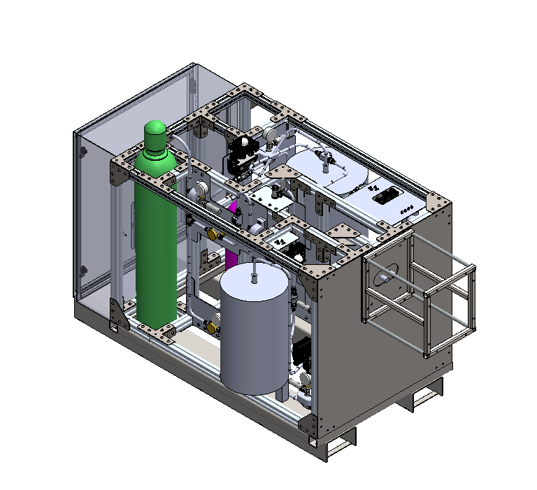 My rocketry club plans to participate in the Collegiate Propulsive Lander Challenge, where the goal is to create a self-landing rocket. To design this rocket, we must be able to test our feed system and various engine designs. The test stand is a structure containing a liquid propellant feed system that different engine iterations can attach to for testing. I was given a Piping and Instrumentation Diagram along with links to the selected off-the-shelf components, and a SolidWorks file containing the pressure vessels and boundaries of the structure. With these resources, I was tasked with designing the Rocket Engine Test Stand in SolidWorks PDM.